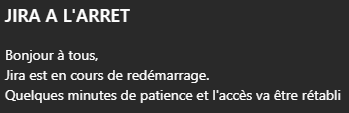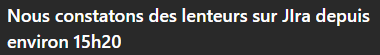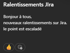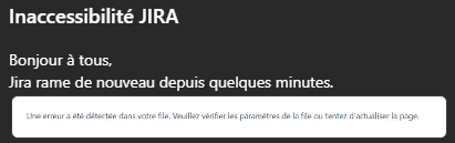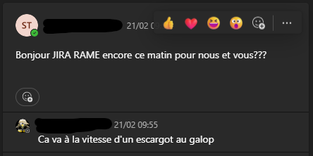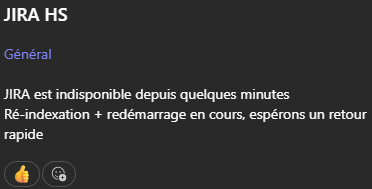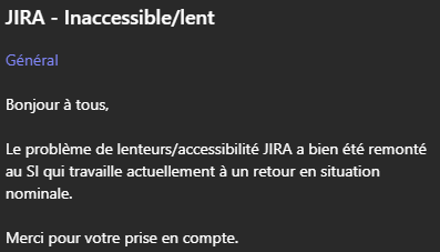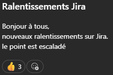 Message : "Inaccessibilité JIRABonjour à tous,Jira rame de nouveau depuis quelques minutes."Message : "Nous constatons des lenteurs sur JIra depuis environ 15h20"Message : "Ralentissements JiraBonjour à tous,nouveaux ralentissements Jira.Nous avons remonte l'alerte" et 2 likes sur le message.Message : "Ralentissements JIraBonjour à tous,nouveaux ralentissements sur Jira.le point est escaladé" et un like sur le message.Message : "Ralentissements JiraBonjour à tous,nouveaux ralentissements sur Jira.le point est escaladé" et 3 likes sur le message.Message : "Bonjour JIRA RAME encore ce matin pour nous et vous ???"Réponse : "Ca va a la vitesse d'un escargot au galop"Message : "JIRA - Inaccessible/lentBonjour à tous,Le problème de lenteurs/accessibilité JIRA a bien été remontéau SI qui travaille actuellement a un retour en situationnominale.Merci pour votre prise en compte."Message : "JIRA HSJIRA est indisponible depuis quelques minutesRé-indexation + redémarrage en cours, espérons un retourrapide" et un like sur le messageMessage : "JIRA A L'ARRETBonjour à tous,Jira est en cours de redémarrage.Quelques minutes de patience et l'accès va être rétabli"
