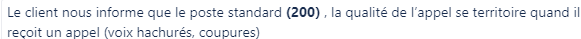 L'appel du millieux Nicolas 28 nov. 2024 Texte : "Le client nous informe que le poste standard (200), la qualité de l'appel se territoire quand il reçois un appel (voix hachurés, coupures)"