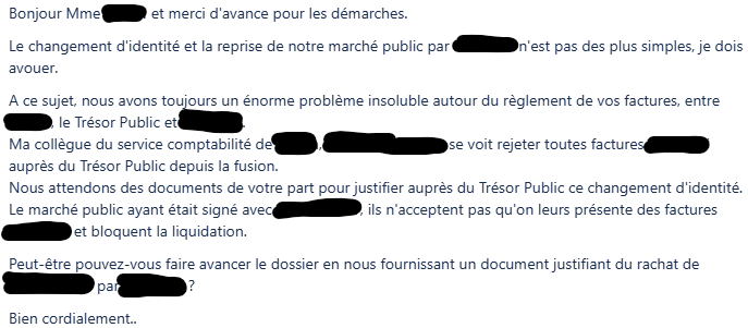 Texte : "Bonjour Mme **** et merci d'avance pour les démarches.Le changement d'identité et la reprise de notre marche public par ******* n'est pas des plus simples, je dois avouer.A ce sujet, nous avons toujours un énorme problème insoluble autour du règlement de vos factures, entre ******, le Trésor Public et *******.Ma collègue du service comptabilité de ******, ******** ******* se voit rejeter toutes factures ******* auprès du Trésor Public depuis la fusion.Nous attendons des documents de votre part pour justifier auprès du Trésor Public ce changement d'identité. Le marché public ayant était signé avec ********, ils n'acceptent pas qu'on leurs présente des factures ******* et bloquent la liquidation.Peut-être pouvez-vous faire avancer le dossier en nous fournissant un document justifiant du rachat de ******** par ******* ?Bien cordialement .."