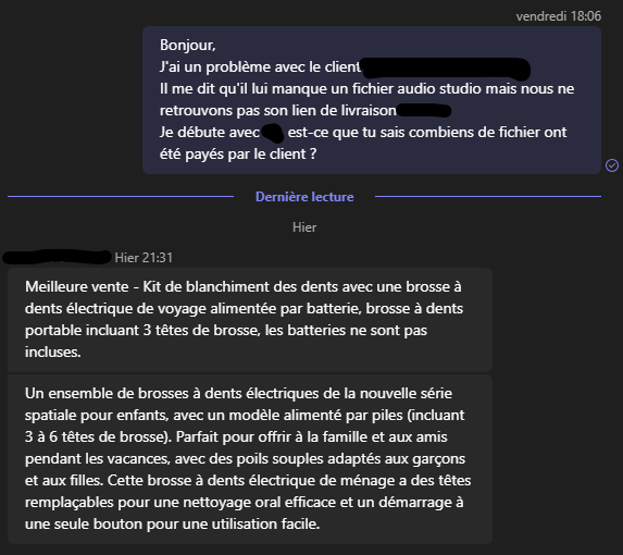Conversation Teams, je demande à un commercial s'il saurais combiens de fichiers audio le client a commandé.La réponse : "Meilleure vente - Kit de blanchiment des dents avec une brosse à dents électrique de voyage alimentée par batterie, brosse à dents portable incluant 3 têtes de brosse, les batteries ne sont pas incluses.Un ensemble de brosses à dents électriques de la nouvelle série spatiale pour enfants, avec un modèle alimenté par piles (incluant 3 à 6 têtes de brosse). Parfait pour offrir à la famille et aux amis pendant les vacances, avec des poils souples adaptés aux garçons et aux filles. Cette brosse à dents électrique de ménage a des têtes remplaçables pour une nettoyage oral efficace et un démarrage à une seule bouton pour une utilisation facile."