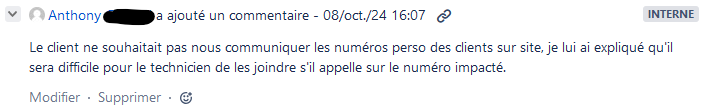 Parle à mon cul Nicolas 9 oct. 2024 Le client ne nous fournis pas de contact sur site et demande à être appelé sur le numéro en panne.